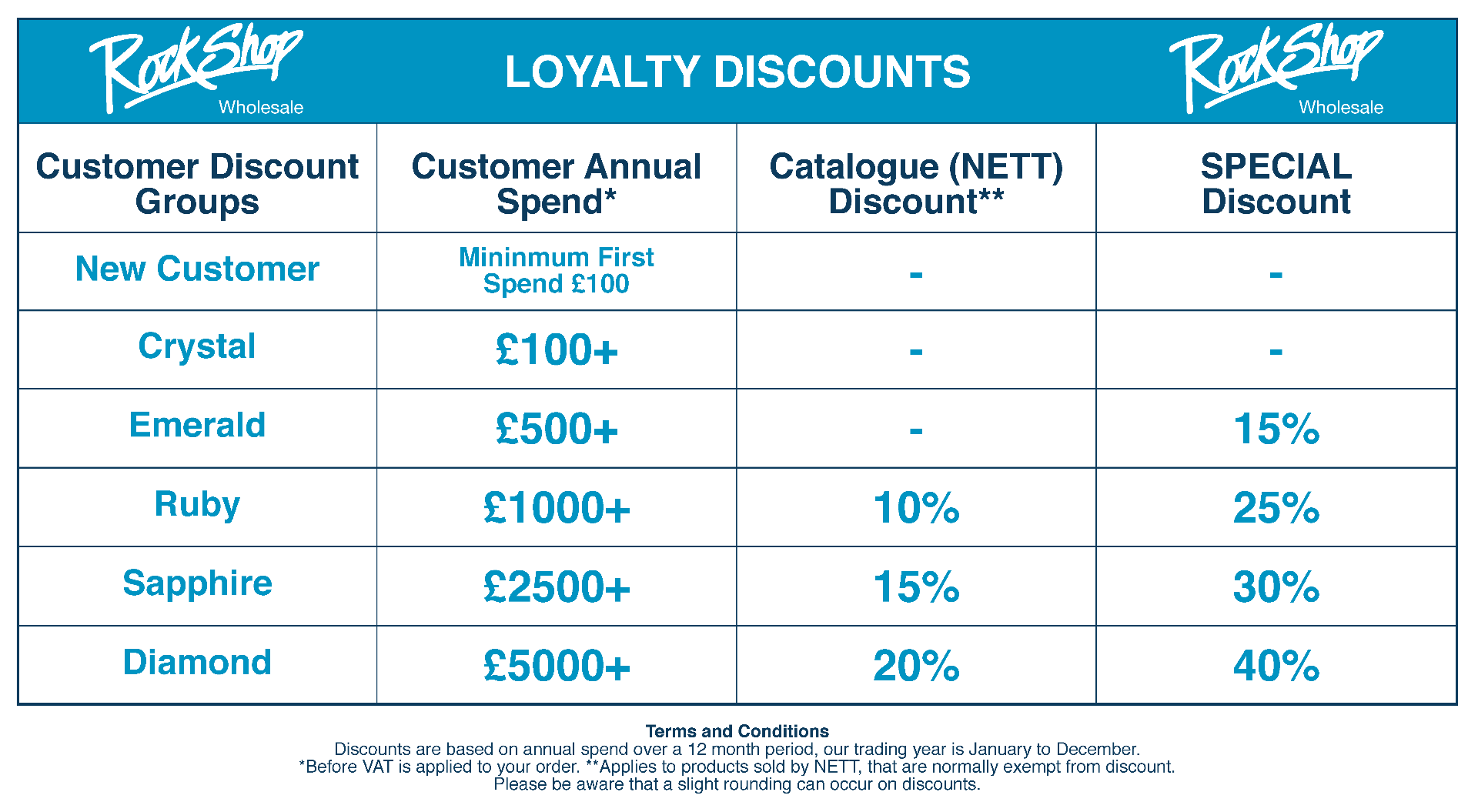 Our Loyalty Discounts start once your account spending has reached or exceeded £500* within a 12-month trading period. Once your account orders have reached £500* you will automatically receive 15% off your next order. Customers who spend more than £1000* annually will start to receive a discount on NETT products, these are normally exempt from any discounts. Please see the table below for the full range of loyalty discounts, and remember, the more you spend the higher the discount. *Before vat and after discounts applied.